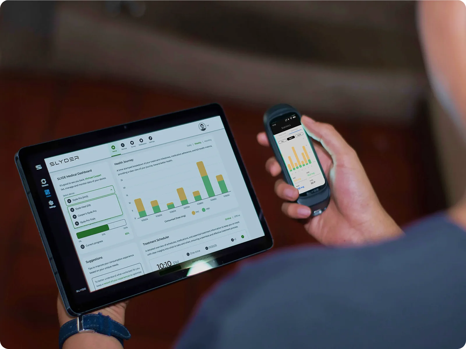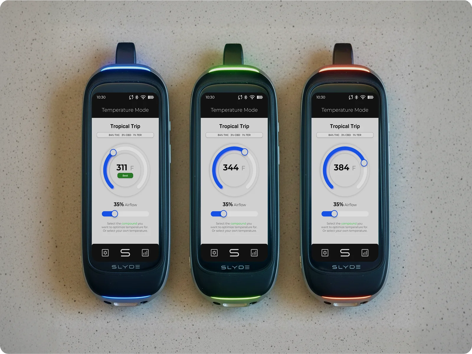 SLYDER Pro is intended for adult recreational use only. Session data, consumption tracking, and mood feedback features are provided for personal reference and do not constitute medical advice. Results may vary based on adapter type, usage conditions, and individual device settings. Battery life estimates are based on controlled testing under standard conditions; actual performance may vary. Compatible adapters sold separately. Bluetooth and Wi-Fi connectivity require compatible network infrastructure. App availability subject to regional App Store and Google Play listings. SLYDER Pro dashboard requires an active internet connection for data sync.